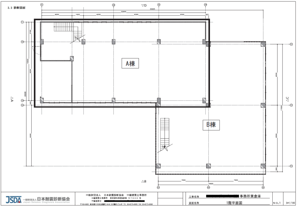 建物はRC造ラーメン架構の2棟がL字型に接続された構成であったため、A棟・B棟に区分して耐震診断を実施しました。診断方法については、耐震補強(設計を含む)の可能性に加え、解体も選択肢として検討されていたことから、第一次診断法により評価を行いました。