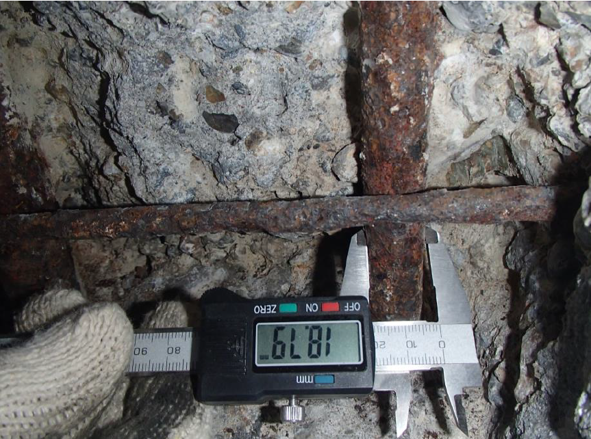 このようにコンクリートを部分的に開口して鉄筋調査を行い、鉄筋に発錆が確認された場合には、既存の鉄筋断面およびコンクリート断面の低下を考慮したうえで耐力評価を行います。