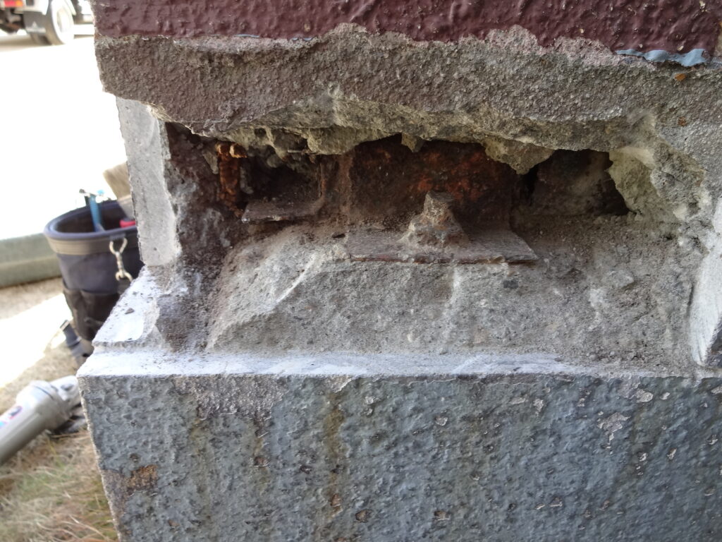 これは基礎と鉄骨躯体を緊結し、建物が水平力を受けた際に転倒しないよう基礎に固定する役割があります。鉄骨造においては可能な限り、柱脚部分を斫り、アンカーボルトが適切に施工されているかを確認します。