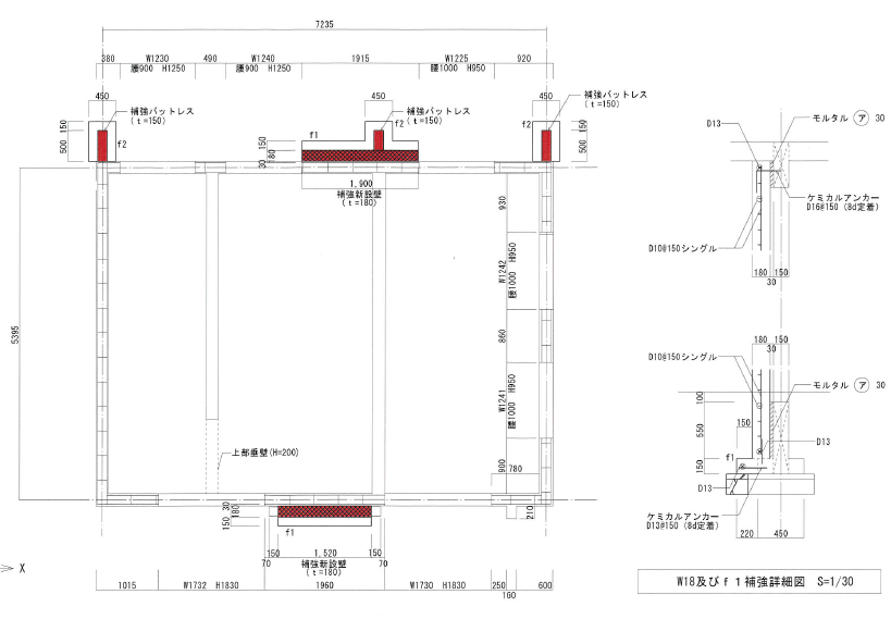 既存壁に寄り添わせる形で新設壁を配置し、地中梁から上階梁までを一体的に緊結することで、既存壁の耐力向上を図りました。